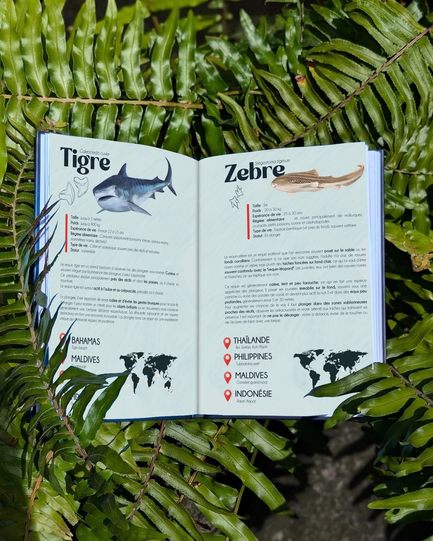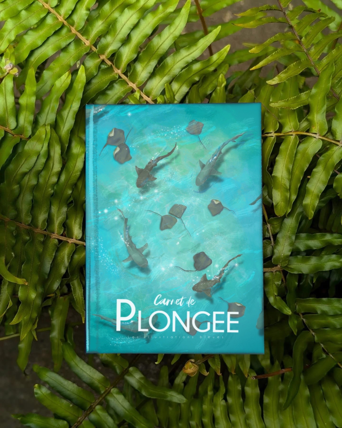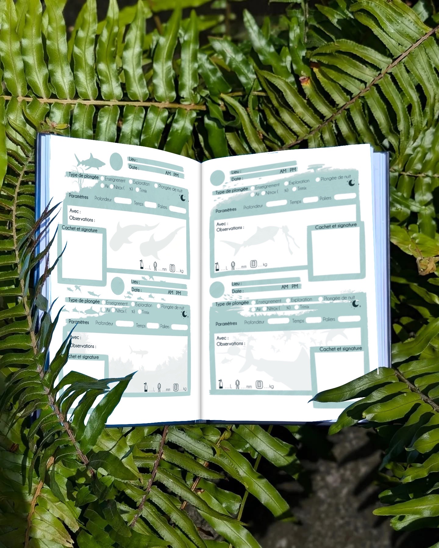Plus qu’un carnet de plongée : un véritable livre. On peut y noter 120 plongées… mais ce qui le distingue des autres carnets, ce sont ses 40 pages d’illustrations. Entièrement dessinées et rédigées par mes soins, on y retrouve plus de 140 animaux sous la forme de plaquettes scientifiques, mais egalement du contenu pédagogique pour aider dans la pratique de la plongée…, ou encore de nombreuses pages de sensibilisation environnementale