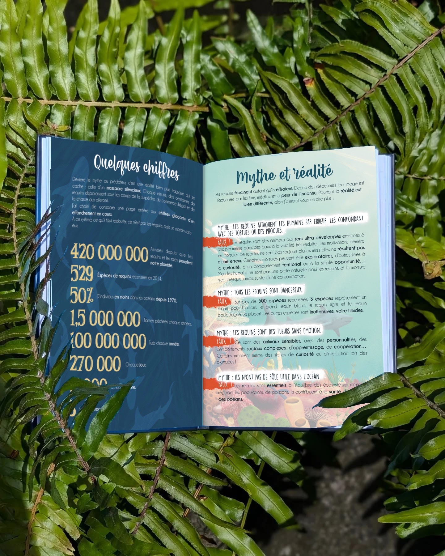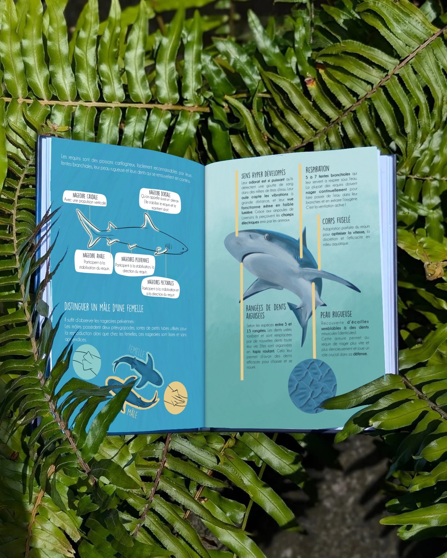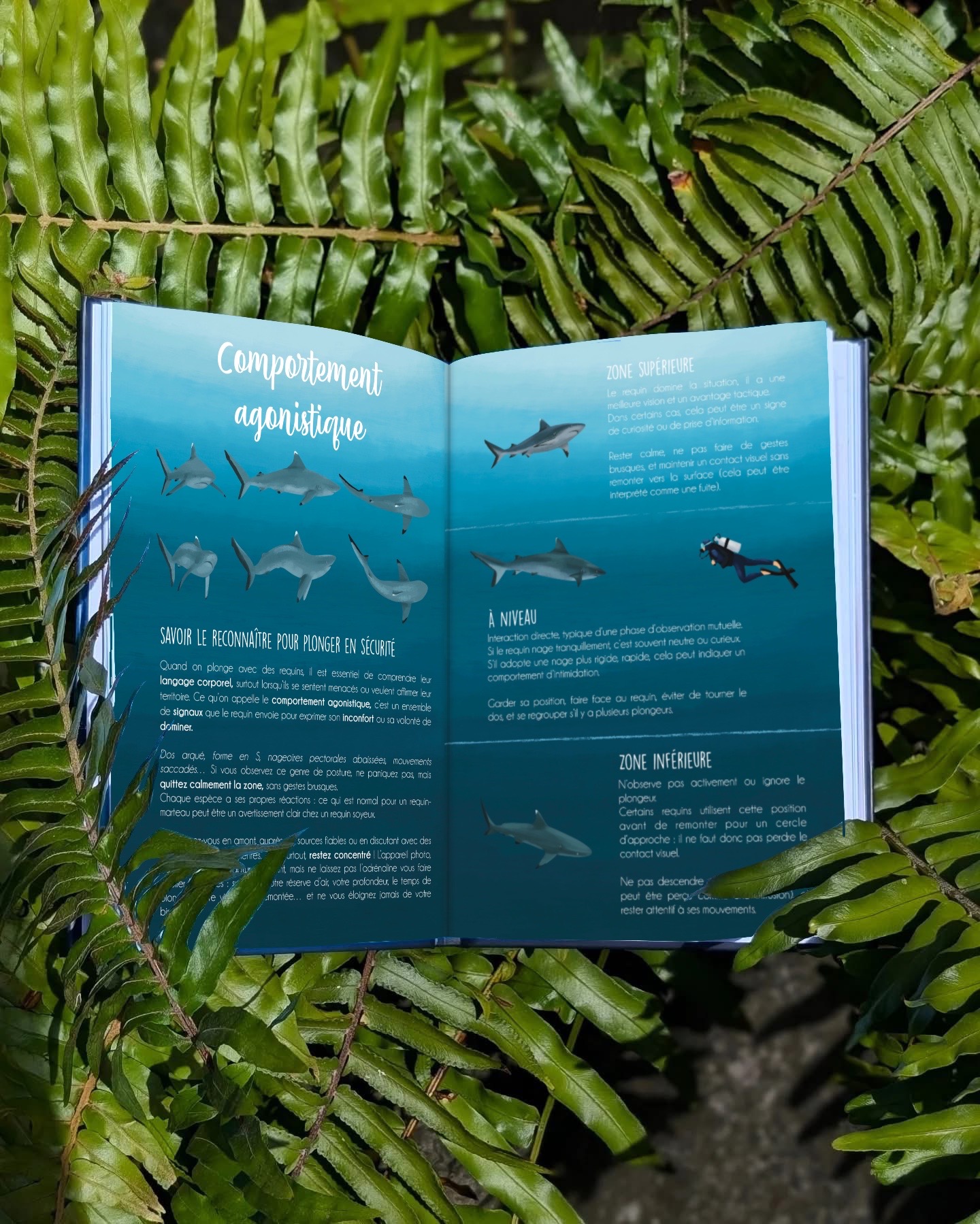 Plus qu’un carnet de plongée : un véritable livre. On peut y noter 120 plongées… mais ce qui le distingue des autres carnets, ce sont ses 40 pages d’illustrations. Entièrement dessinées et rédigées par mes soins, on y retrouve plus de 140 animaux sous la forme de plaquettes scientifiques, mais egalement du contenu pédagogique pour aider dans la pratique de la plongée…, ou encore de nombreuses pages de sensibilisation environnementale