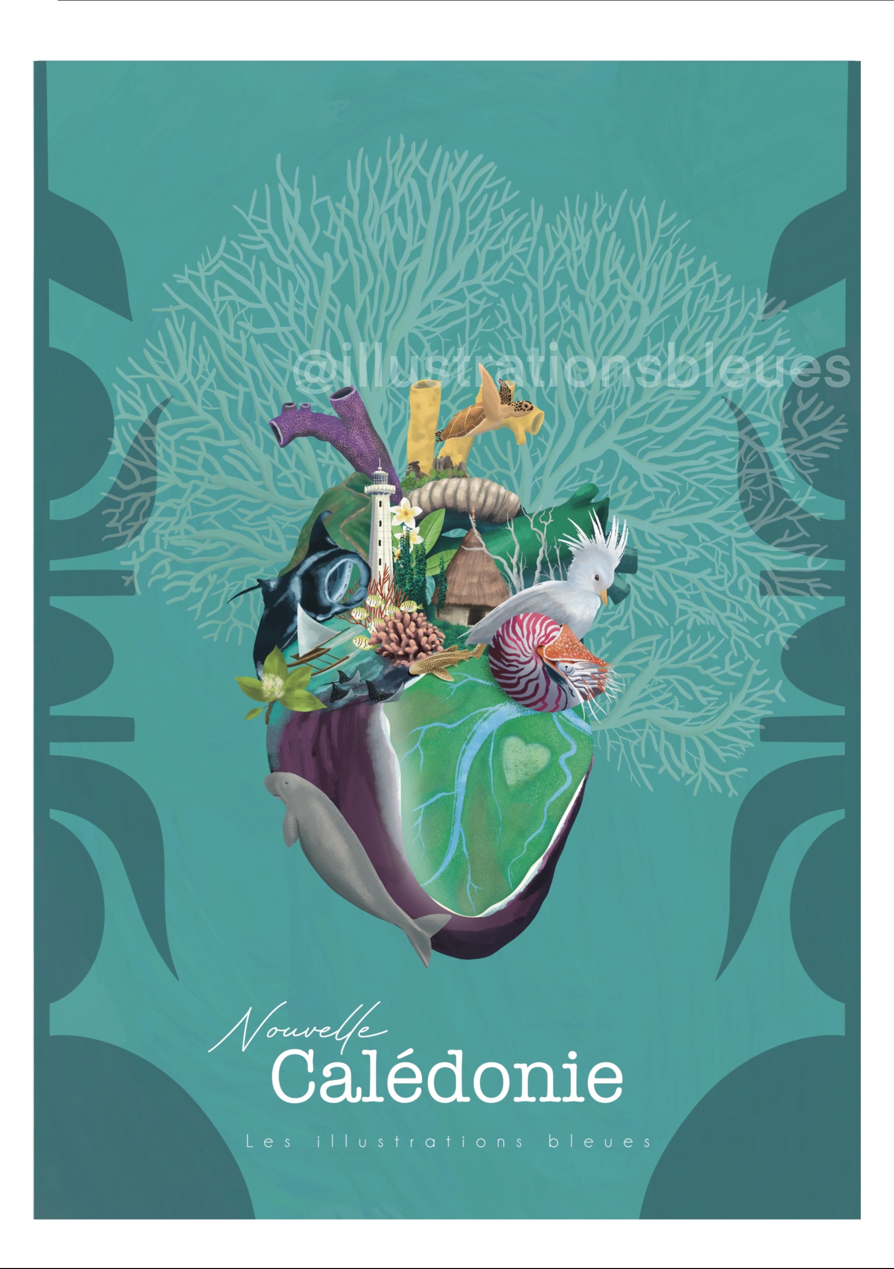 Le coeur de la Nouvelle Calédonie, un organe constitué de l’essence même de l’île la plus proche du paradis. Perdez vous sur les nombreux détails qui composent ce cœur anatomique entièrement dessiné à la main.
